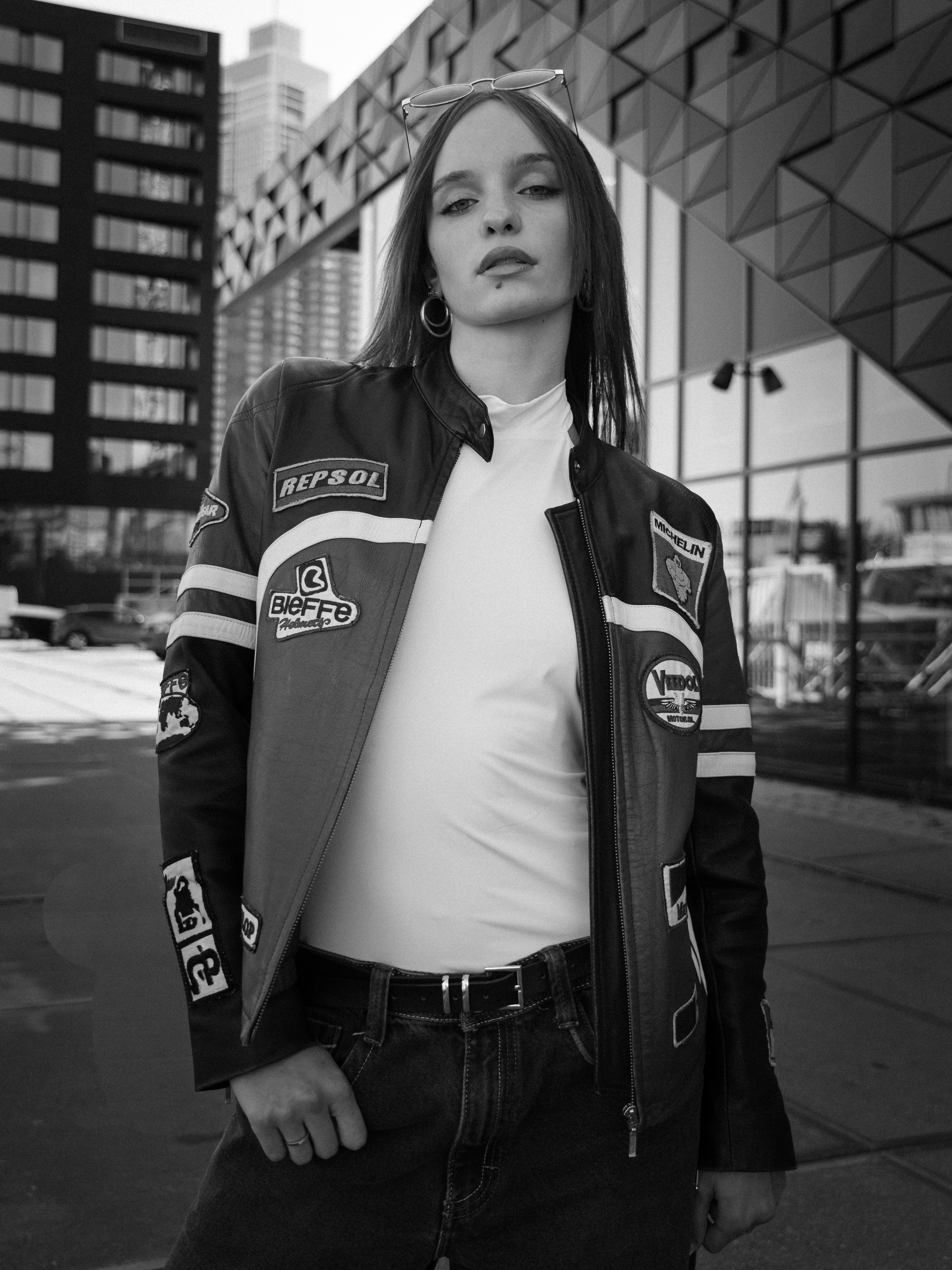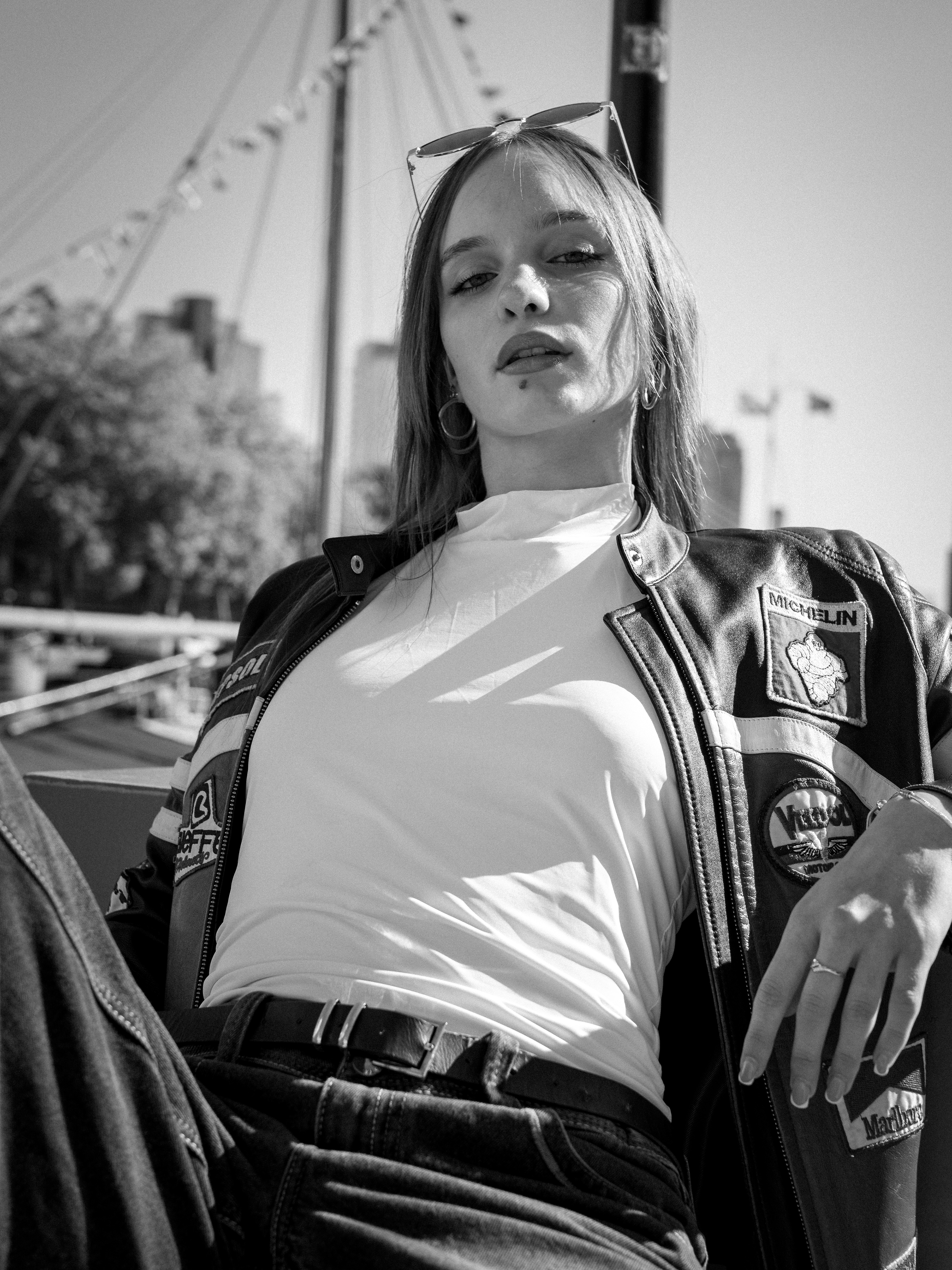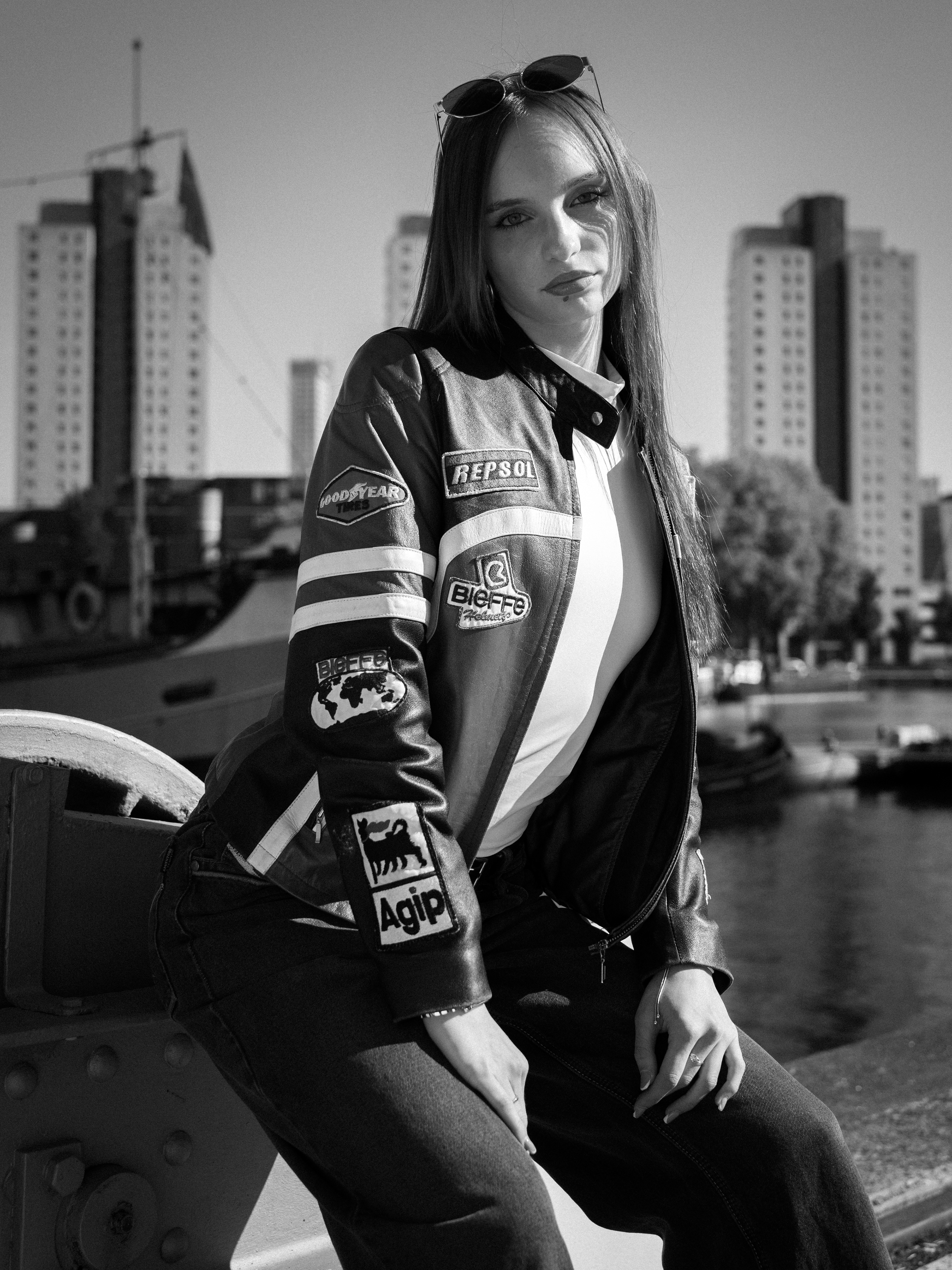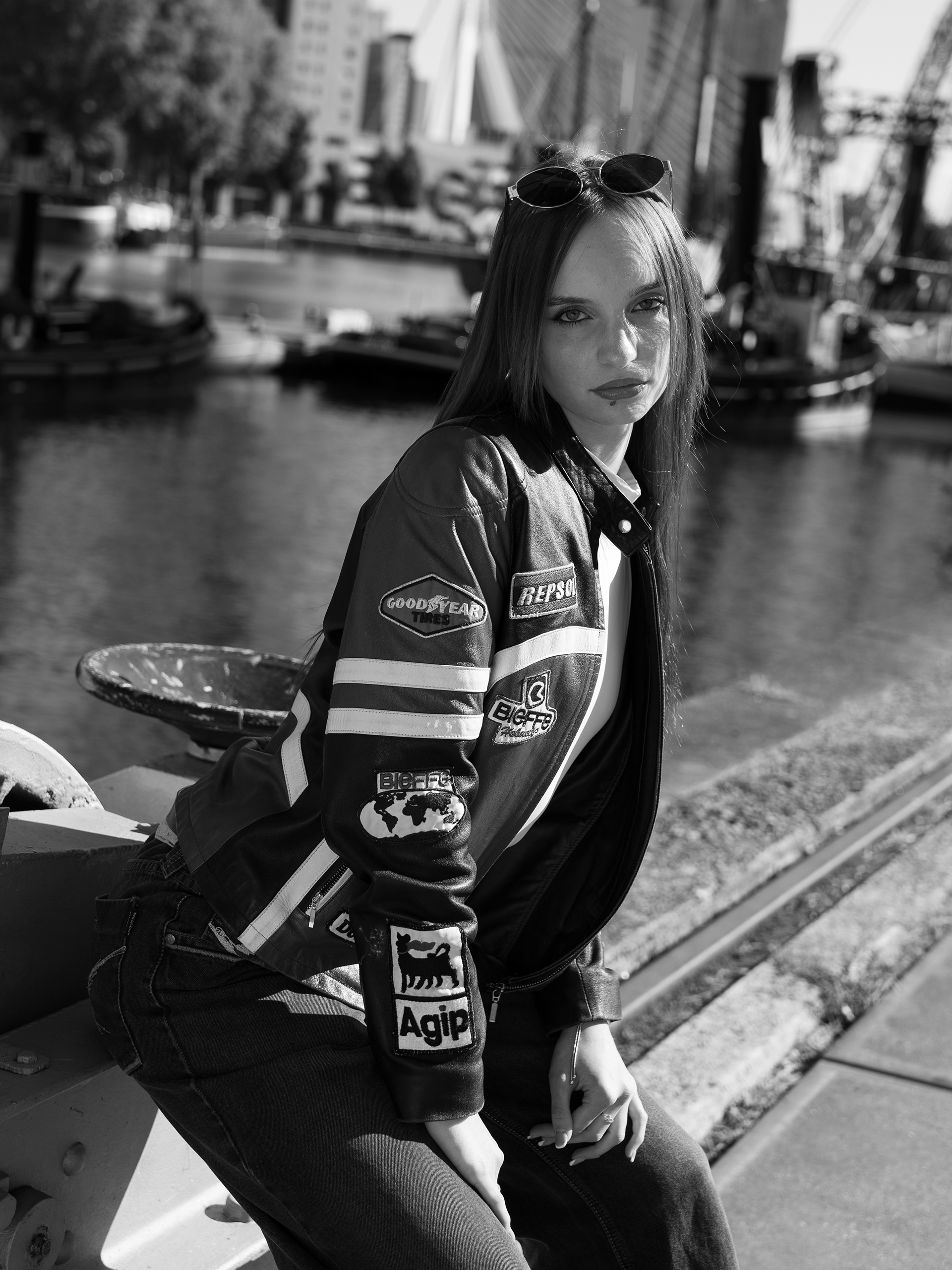 Madara doesn’t just stand at the pier, she owns it. With leather stitched in legacy and a stare that doesn’t flinch, she turns concrete, salt air, and steel into her arena. This is where street meets sea, and pressure becomes power.