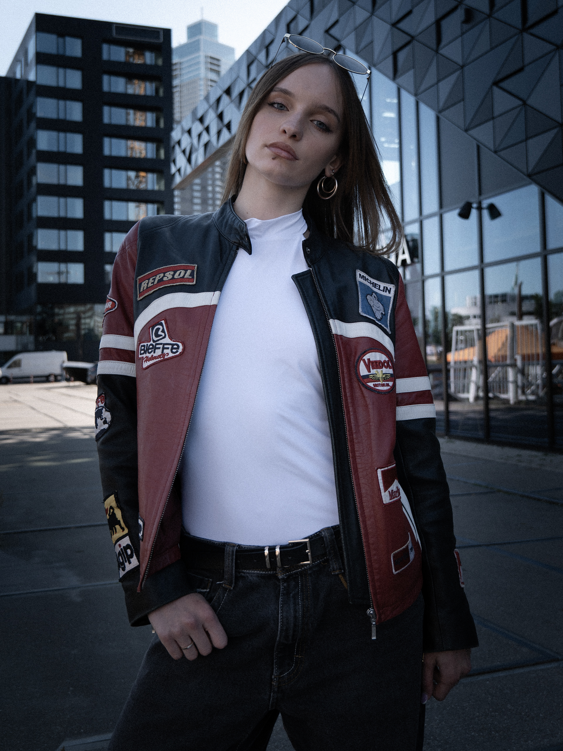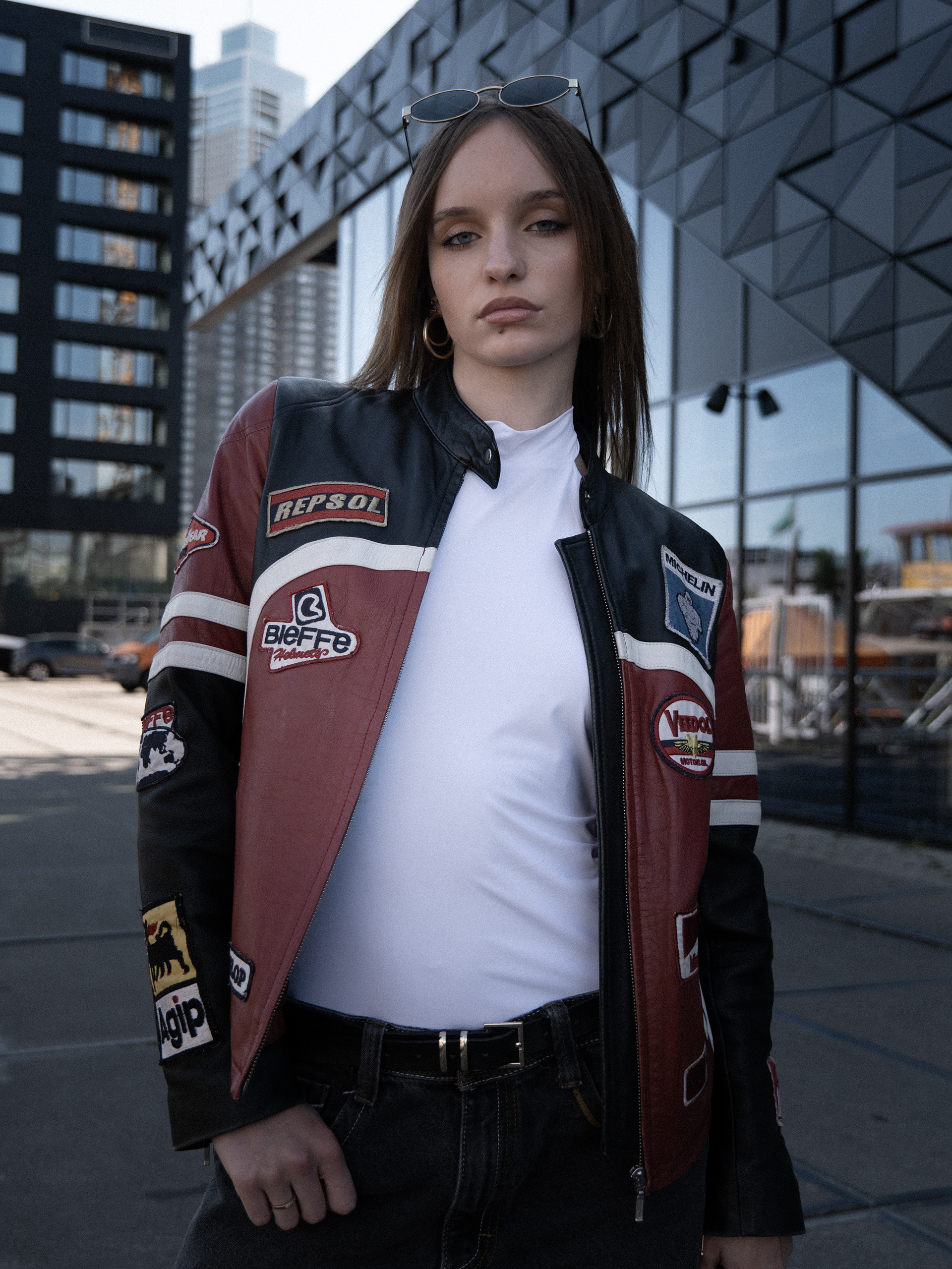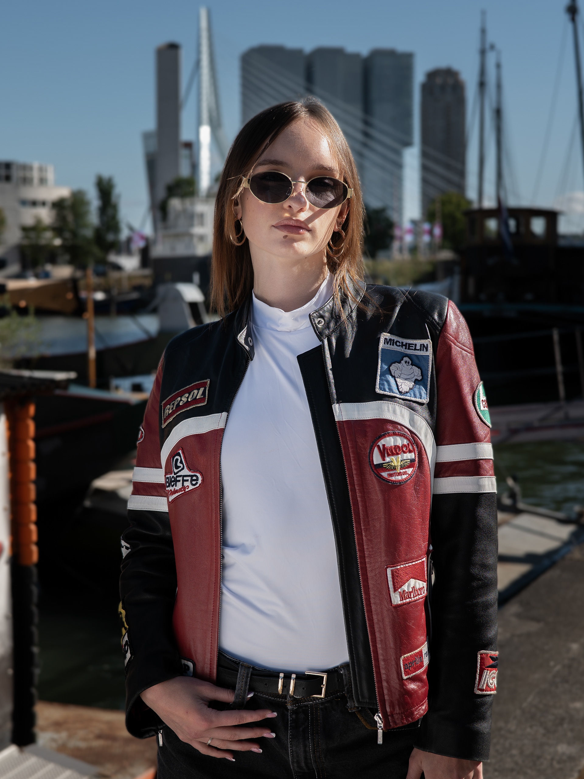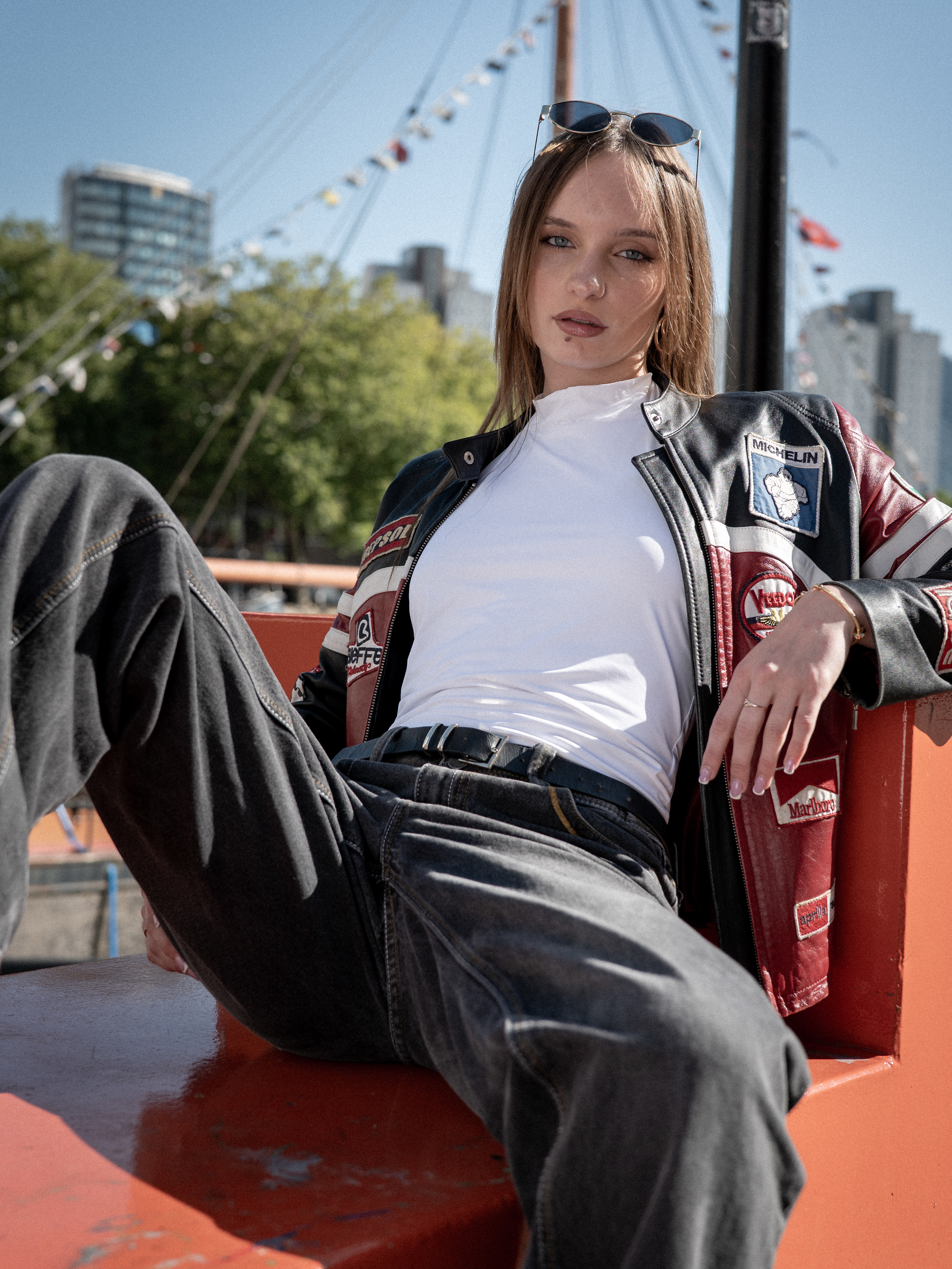 Madara doesn’t just stand at the pier, she owns it. With leather stitched in legacy and a stare that doesn’t flinch, she turns concrete, salt air, and steel into her arena. This is where street meets sea, and pressure becomes power.